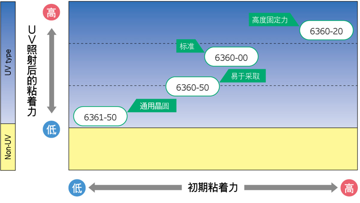 粘著力:(2.6N/10mm, UV硬化后0.10 N/10mm)※在90°剝離條件下進(jìn)行測量